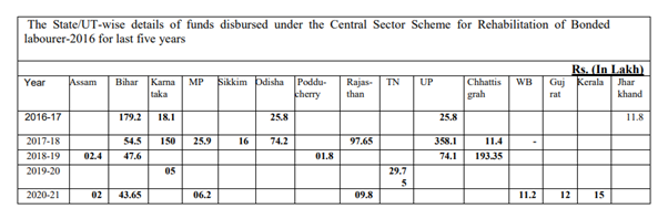 The data presented in the table highlights a clear lack of proactiveness from many states in accessing funds under the Scheme for Rehabilitation of Bonded Labour. While a few states such as Uttar Pradesh, Chhattisgarh, Bihar, and Karnataka have received allocations in specific years, several others show negligible or no disbursement at all. This uneven participation indicates not only gaps in the identification of bonded labourers but also inadequate initiative by state governments to fully utilize central support for rehabilitation efforts. Strengthening monitoring mechanisms and ensuring proactive engagement by states is crucial to make the scheme more effective and impactful.